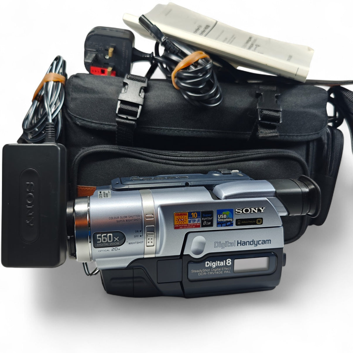• The Sony Handycam DCR-TRV140E Camcorder is a sleek silver handheld digital video camera that offers impressive features such as night vision, image stabilisation, and a 20x optical zoom.