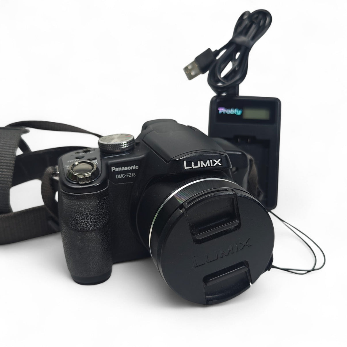 • The Panasonic LUMIX DMC-FZ18 is a well-regarded retro-style digital bridge camera, offering 8.1MP resolution and a powerful 18x optical zoom. Its classic black design and 2.5-inch screen make it a solid choice for casual photographers or collectors. Key features include face detection, image stabilization, and a built-in flash for reliable everyday shooting. The camera comes with a charger and weighs just 360g, making it easy to carry. A good-quality, lightweight bridge camera that's beginner friendly.