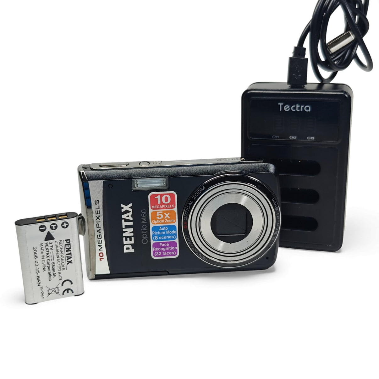 • The Pentax Optio M60 10MP Digital Camera is a compact digicam with a 5x optical zoom and a maximum resolution of 10.0 MP. It features a 2.5-inch screen, a lithium-ion battery, and connectivity via USB. The camera includes a range of features such as red-eye reduction, image stabilization, built-in flash, and audio recording capabilities. The sleek black design and included charger make it a convenient and versatile option for photography enthusiasts looking for a reliable digital camera from the trusted brand Pentax.