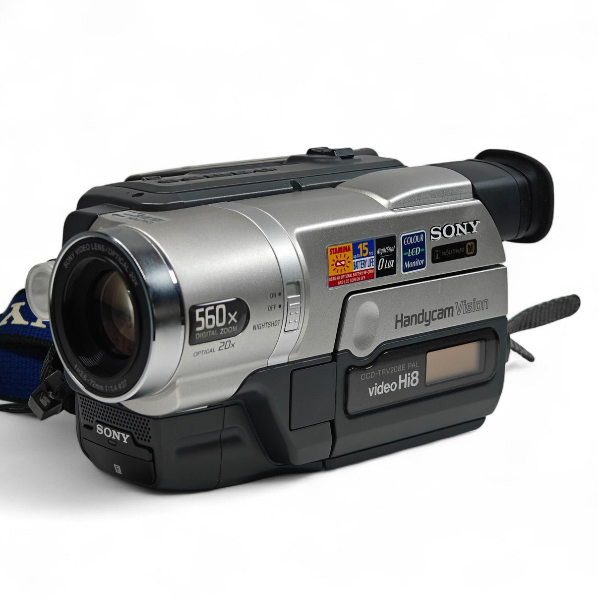 • The Sony Handycam CCD-TRV208E Camcorder is a sleek silver handheld device that offers advanced features such as digital zoom up to 560x, optical zoom of 20x, and night vision capabilities. It boasts a 2.5-inch LCD screen for easy viewing, along with image stabilization technology for sharp images. This unit, part of the Sony Handycam series, also features built-in microphone, PAL compatibility, and comes with a charger for convenience. With its standard definition recording format and Hi8 media format, this camcorder provides quality playback on your tapes or memory cards. Perfect for capturing memories in a compact and user-friendly package.
