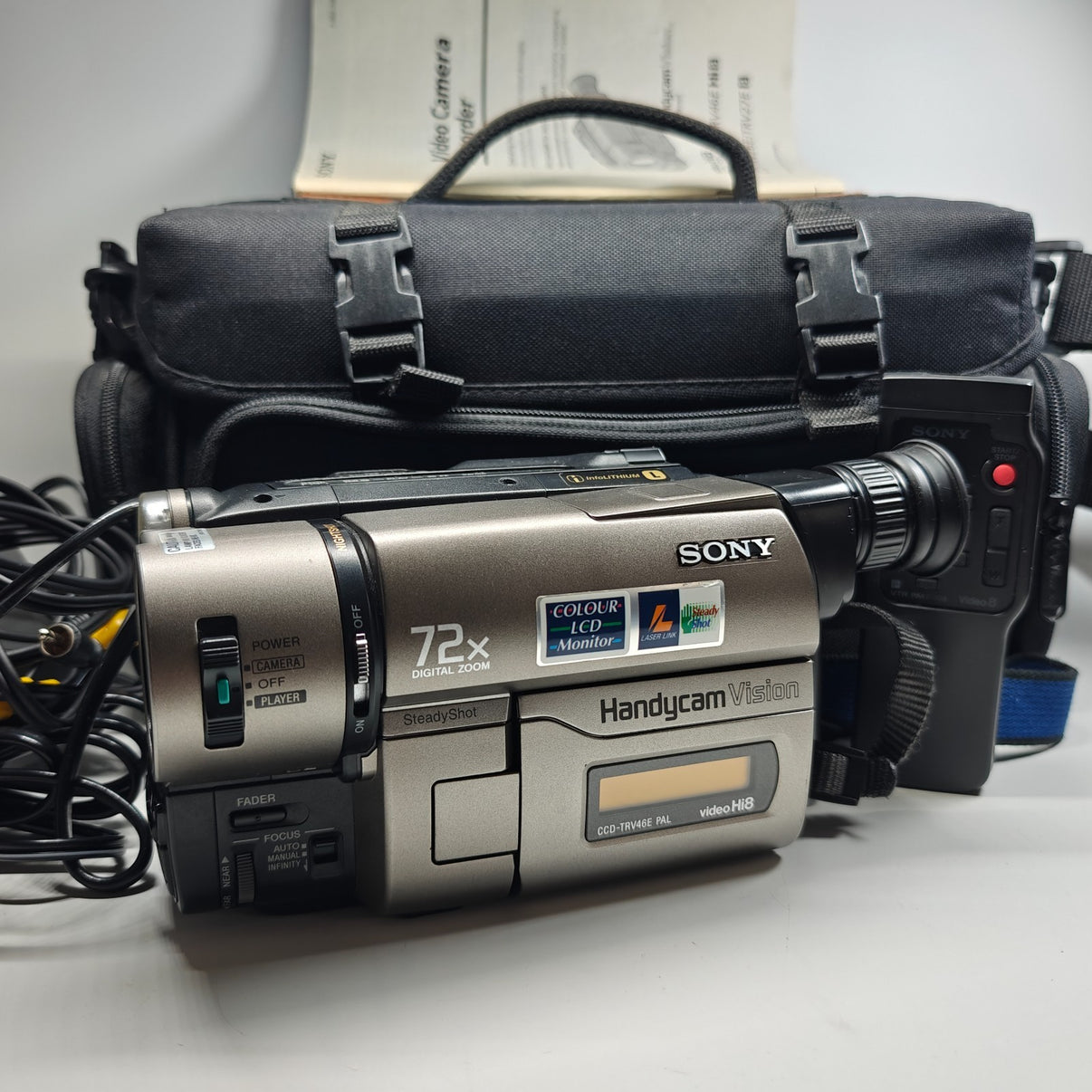 • The Sony Handycam Vision CCD-TRV46E Camcorder blends retro charm with high-quality performance, featuring a sleek grey design. With a 72x digital zoom and 18x optical zoom, it captures crisp, detailed footage, whether you're filming close-ups or distant scenes.